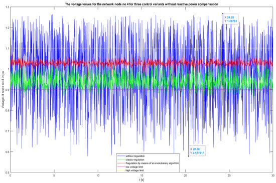 Figure 13. The voltage values for the network node no 4 for three control variants without reactive power compensation.