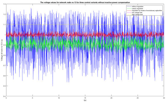 Figure 16. The voltage values for the network node no 13 for three control variants without reactive power compensation.