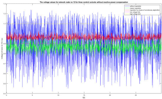 The table below shows the minimum, maximum, average and variance voltage values for the selected nodes (Table 4). The results of the statistical analysis for the three variants of voltage regulation confirm the conclusions of the presented voltage diagrams (Figure 11, Figure 12, Figure 13, Figure 14, Figure 15, Figure 16 and Figure 17). When analyzing the minimum and maximum values for the three control variants, it is clear that in the case of no regulation, these values are outside the range of permissible values. In the case of classical regulation, there was an improvement. It is true that the minimum values exceed the lower limit of the permissible voltage range. Only the results obtained using the evolutionary algorithm with access to the current measurement values of the network nodes allowed for a significant improvement in the quality of voltage regulation. The minimum voltage is slightly below the permissible value, but it still doubles compared to the other variants. Variance is a measure of the volatility of a given. In the case of voltage regulation, despite the changes in the voltage supplying the substation and changes in the power consumed in stations 15/0.4, the system is designed to maintain the range of voltage changes within the permissible range. Moreover, it was shown that the voltage variability was about 100 times lower in all analyzed nodes in relation to the other control variants (evolution algorithm).