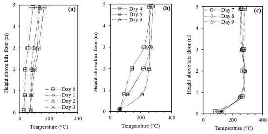 - The overall performance of the kiln is poor in terms of charcoal yield (≈23 wt.%) and quality, the latter mainly evidenced by its low fixed carbon contents (values as low as 60 wt.% are possible). This follows from key limitations in the kiln: the low maximum temperatures observed in most of the carbonization chamber (typically less than 300 °C), the inability to raise the temperature at the kiln floor above 130 °C, and the high O2 levels inside the kiln (often above 5 vol.%). Then significant amounts of byproducts are obtained: partially charred wood, charcoal fines, permanent gases, and liquids. While the partially charred wood is reused in the process and the charcoal fines marketed (mainly for briquette manufacturing), the gases and liquids are currently discharged into the atmosphere and soil. The gas composition is most favorable between days 4 and 7 of the cycle, where the concentration of combustible species (mainly, H2, CH4, and CO) and the LHV of the gas is higher; at this stage, the carbonization gas can approach the quality of gases from direct biomass gasifiers. Otherwise, the gas quality is very low, which can halt valorization, although it needs some kind of treatment before discharge into the atmosphere.