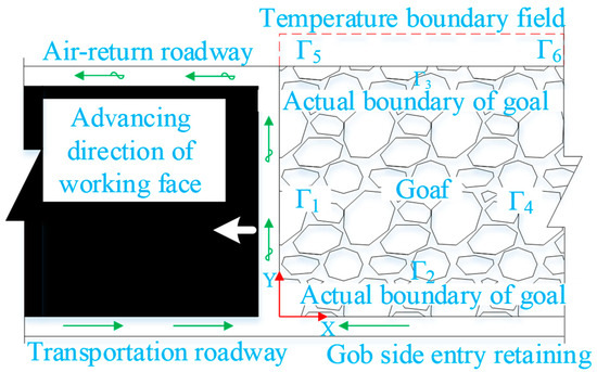 It can be known from Figure 2 that ① the bottom of the goaf Γ1 and the boundary of Γ2 are treated according to the wind pressure boundary conditions; ② the top of the goaf Γ1, Γ4, Γ5, Γ6, Γ7 are adiabatic boundaries, that is, the heat flux is 0. The boundary conditions are [14]: