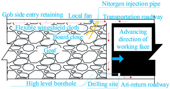 Retaining roadways without pillars along the goaf is currently a common mining technology used in domestic coal mining [1,2], which, in essence, is to preserve the mining roadways along the goaf for the next section. The roadway along the goaf inevitably contacts the goaf, which causes the air in the roadway to enter the goaf and mix with various gases in the goaf. In special circumstances, when the heat released from the oxidized coal in the goaf has not been evacuated in time, fire or even an explosion may occur with an increase in temperature. The spontaneous combustion of leftover coal in the goaf is one of the main disasters in coal mines, and its prevention and control are the focus of mine safety [3,4].