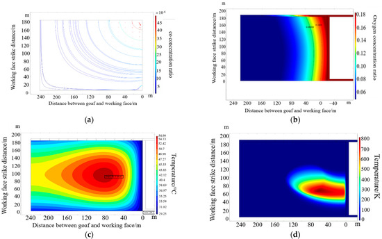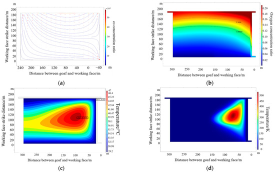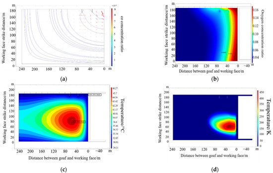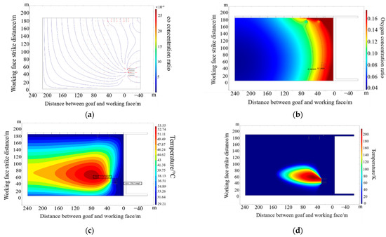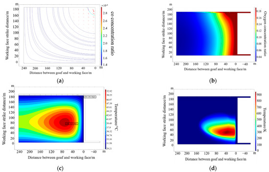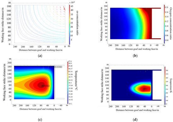 Oxidation characteristics of residual coal in goaf by high-level boreholes during mining. (a) Vector graph of the velocity and its streamline of goaf. (b) Distribution of the oxidation zone. (c) Distribution of temperature. (d) Distribution of CO.