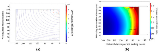 Figure 4 shows the simulation results of the goaf oxidation characteristics when the roadway is 200 m, along with no anti-leakage measures. Figure 5 and Figure 6 show the simulation results of the goaf oxidation characteristics when the roadway is 200 m and 500 m, respectively. In addition to measures such as a built-in flexible wind-retaining cloth, a fixed external steel cable, and closing the plate every 50 m during the mining period in order to ensure the normal entry of personnel in the process of roadway retaining, a local fan was set at 20–30 m from the working face, and the air supply was conducted through the air duct with an air supply volume of 400 m3/min.