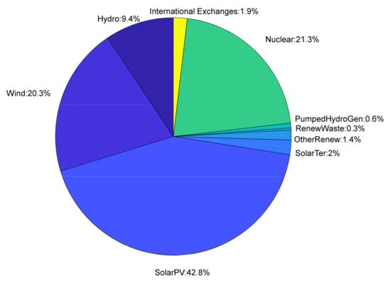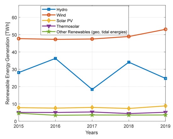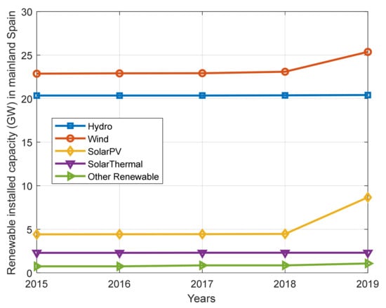 In recent years, the share of renewable generation in the electric generation mix of most of the countries has increased, motivated by the need to reduce emissions and by its rapid cost decrease. In the Spanish mainland system, the renewable power installed capacity by the end of 2019 was 54.3 GW, (46.54% from wind, 31.5% from hydro, 16.2% for solar PV, and 4.2% for solar thermal) [] and, only during 2019, 6.50 GW of new renewable power plants were installed (4.2 GW based on solar PV and 2.3 GW based on wind). The forecast is that these figures will increase significantly in the future worldwide []. According to [], renewables will become cheaper than existing coal and gas in most regions of the world before 2030.