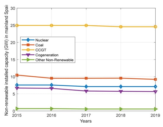 In the last five years, the Spanish economy has emerged from a deep recession, directly affecting the national electricity consumption. At the beginning of the crisis, in 2008, the electricity demand in Mainland Spain reached its maximum value of 263.53 TWh, while, in 2014, it reached the minimum one during the current century, with an annual demand of 248 TWh. Since then, the electricity demand of Mainland Spain has been growing at a moderate rate, reaching 249.14 TWh in 2019 [].