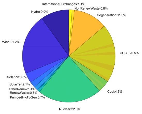 Regarding demand coverage (see Figure 3), the main contributor in 2019 was nuclear energy, with a contribution of 22.3%, followed by wind energy (21.2%), CCGT (20.5%), and cogeneration (11.8%). Hydro energy was the fifth contributor, with 9.9%, conventional coal thermal power plants’ contribution was 4.3%, and solar thermal contribution reaches 2.1%.