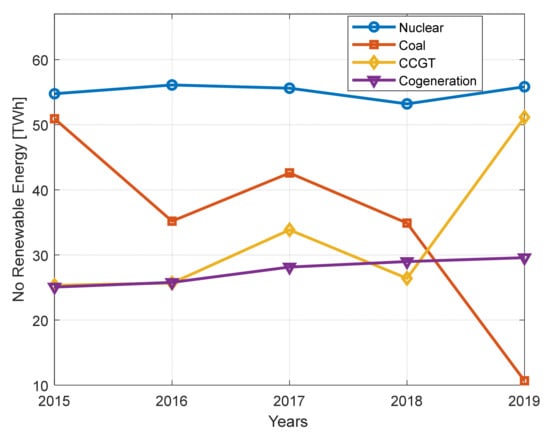 Similar behavior is found in other non-renewable source generation, as presented in Figure 5. Nuclear production has remained almost constant, at around 55.1 TWh per year, and cogeneration grew slightly from 25.1 TWh in 2015 to 29.6 TWh in 2019. In 2019, there was a significant increase in the production with CCGT (almost doubling the 26.4 TWh production from 2018 to 51.1 TWh in 2019) to the detriment of the coal energy production, reducing its value from 35 TWh in 2018 to 10.7 TWh in 2019.