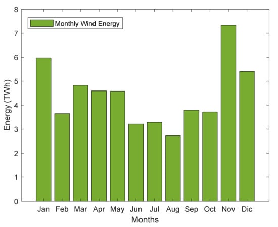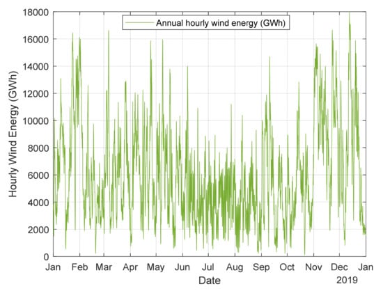 As was previously mentioned, the main problem of renewable energy is its variability. Figure 6 shows the monthly production of wind generation in Spain in 2019, where seasonal non-regular dips are observed during summer months (June–August) [], while Figure 7 presents the hourly wind energy variability over one year.