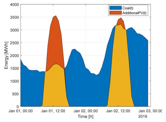Hourly energy generated by additional PV (orange) and coal (blue) during the 1st and 2nd of January 2019.