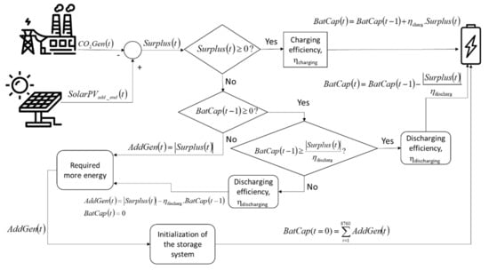 In order to evaluate the replacement of fossil-based power plants, the main objective of the storage algorithm (Algorithm 1) is calculating the storage capacity of the PV–ESS hybrid system that allows us to cover the energy balance between the thermal electric and PV generation. Because different types of ESSs can be used to store the surplus energy generated by the PV systems, we adopt a conservative RTE of 85% (ηcharg = ηdischarg = 0.922) as a model constrain. This is a mid-range value for different storage technologies, from electrochemical batteries, such as Li-ion, redox-flow, or sodium–sulfur batteries, to PHS [,,].
