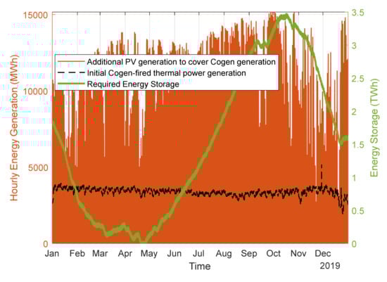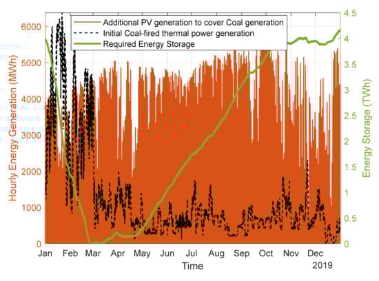 When analyzing Figure 11, it is observed that the initial coal energy generation was very high in the first two months but suffered a sudden reduction on March 2nd. The hourly mean value until that date was 3.7 GWh, and then it was reduced to 0.716 GWh from that point to the end of the year. For this reason, the ESS must be initialized with 3.78 TWh, which is completely depleted in March. Since then, the additional PV system can cover the demand and recharge ESS, reaching a maximum of 4.18 TWh stored at 17:00 h on 31 December 2019.