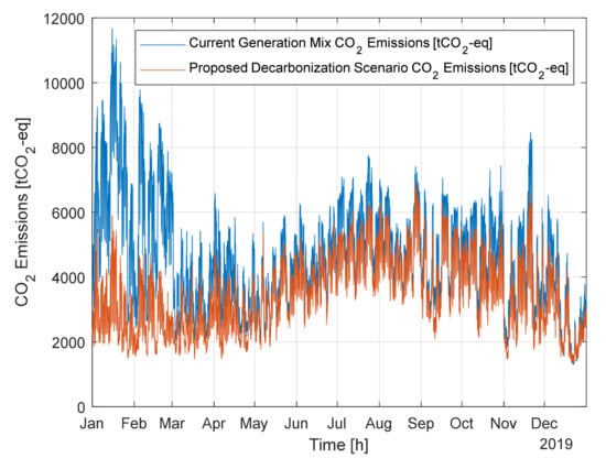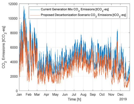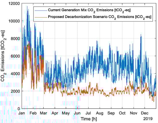Figure 12 presents the hourly CO2 emissions during 2019, with the current generation mix (blue) and after substituting coal-fired thermal power plants (orange). We can observe an annual reduction of 32.9%, going from the initial 40.9 megatons (Mt) to 30.8 Mt.