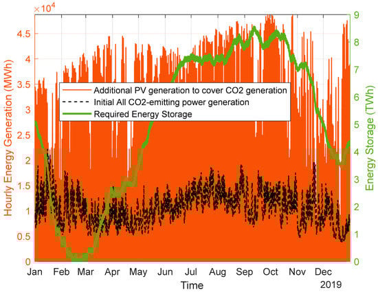 Figure 9 shows the hourly energy produced by SolarPVadd(t) (in orange) and CO2Gen(t) (in this example, the selected polluting technology to be substituted was coal-fired thermal power plants, and it is represented in blue) for the first two days of 2019. It can be seen how, during the night periods, the coal-fired power plants are producing energy, while the PV systems are not generating. During the central hours of the day, this behavior is reversed, and an excess of PV generation is produced that will need to be stored to be used later during the night. Ideally, at the end of the year, the sum of blue and orange areas should be the same.