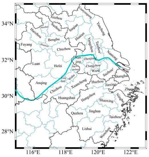 In this paper, the urban agglomeration of the Yangtze River Delta in China was selected as the research object, covering the municipality of Shanghai and Jiangsu, Zhejiang, and Anhui Provinces, with a total area of 358,000 km2, as shown in Figure 1. Jiangsu Province contains the cities of Nanjing, Wuxi, Xuzhou, Changzhou, Suzhou1, Nantong, Lianyungang, Huai’an, Yancheng, Yangzhou, Zhenjiang, Taizhou1, and Suqian. Zhejiang Province consists of the cities of Hangzhou, Ningbo, Huzhou, Jiaxing, Shaoxing, Wenzhou, Quzhou, Lishui, Taizhou2, Jinhua, and Zhoushan. Anhui Province covers the cities of Hefei, Wuhu, Bengbu, Huainan, Maanshan, Huaibei, Tongling, Anqing, Huangshan, Fuyang, Suzhou2, Chuzhou, Lu’an, Xuancheng, Chizhou, and Bozhou.