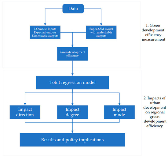 In this study, a Super-SBM was proposed, and Tobit regression analysis was applied to explore the effects of urban development on GDE, which was mainly carried out via two steps: GDE measurement, and impact analysis of urban development on GDE, as shown in Figure 2.
