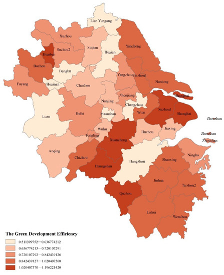 Admittedly, municipalities and large cities (i.e., Suzhou1 and Shanghai in this paper) enjoy rich resource bases, advanced technology platforms, and personnel allocation due to their high administrative levels, guaranteeing the transformation efficiency of output results, and these advantages strongly promote green development in large cities [37]. In this study, coastal cities and cities in the southeast under the background of a relatively developed economy showed higher levels of GDE compared with inland cities in the northern part of the Yangtze River Delta. However, some provincial capitals, such as Nanjing and Hangzhou, have not achieved satisfactory results in GDE. The urban construction in these big cities is in full swing—especially the property market, which has heated up dramatically since 2015, leading to the rise of urban reinforced concrete forest, followed by more construction waste, hindering the benign expansion of green space. Not only the importance of inputs, but also the rationality of outputs, should be taken into account for GDE. Large cities often have redundant inputs and relatively insufficient outputs in the case of lack of flexibility [41].