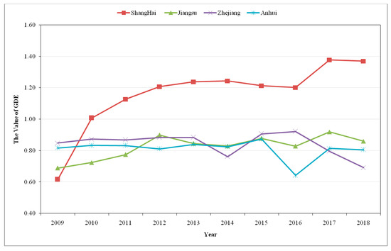 At the provincial level, as shown in Figure 4, the line chart of the annual GDE value calculated by the Super-SBM model reflects the trend of efficiency over time in four provinces. In the last decade, the GDE value showed ansan upward trend from 2009 to 2012 in Jiangsu Province and a downward trend from 2016 to 2018 in Zhejiang Province, fluctuating around 0.8 in Jiangsu, Zhejiang, and Anhui Provinces. In the meantime, the municipality of Shanghai experienced two growth periods from 2009 to 2012 and from 2016 to 2017. Shanghai, whose GDE was once at the lowest level of 0.616, jumped to the leading position, and the gaps between Shanghai and the three aforementioned provinces gradually widened.