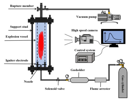 The schematic diagram of the experimental device is shown in Figure 1. The apparatus was mainly composed of an explosion vessel, a powder injection system, an ignition system, a high-speed photography system and time control system.