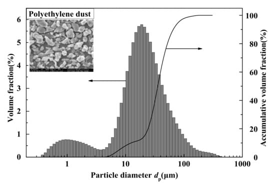 According to the literature, about 63% of polyethylene dust explosion accidents were caused by low density polyethylene []. Therefore, low-density polyethylene was selected for use in this study, and provided by Jiangsu Haosheng Plastics Co, Ltd. (Suqian, China). The particle size distribution and structure are displayed in Figure 2. The overall structure was chip-like, and the surface was rough. The median particle size (d50) was 19.2 μm. It was dried at a constant temperature for 4 h before the experiment. Ethylene used in this study was provided by Henan Yingzhong Chemical Products Co., Ltd. (Zhengzhou, China). with a purity of 99.99%.