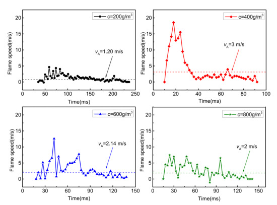 The distance between the flame front and the bottom of the pipeline was measured by the measurement tool in Adobe Photoshop CS6. The time interval of adjacent pictures is 1 ms. Since the time interval between adjacent images is small, the average velocity within in a short time can be approximately regarded as the instantaneous velocity of flame propagation at the corresponding time. Based on the flame front position and the corresponding time, the time-varying curve of the explosion flame propagation velocity of polyethylene dust with different concentrations in a closed vessel was calculated. Combined with the length of the pipeline (L) and the time of the flame front propagating from the ignition electrode to the top of the pipeline (t), the average propagation velocity (vA) of the explosion flame of polyethylene dust with different concentrations in the vessel was calculated. The results are shown in Figure 4.
