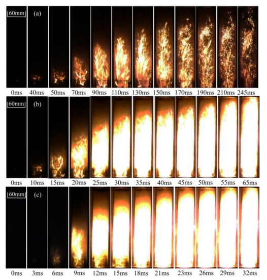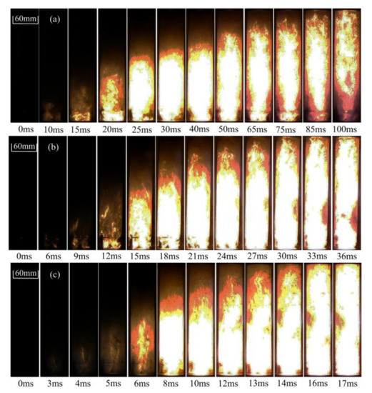 For comparison, the flame propagation characteristics of a polyethylene dust explosion in a closed vessel were first studied. Figure 3 shows the flame structure variation with time for the polyethylene dust explosion. When the polyethylene concentration was 200 g/m3, the flame brightness in the vessel was low, the flame structure was mainly spatial discrete bundles and the flame front was sharp or serrated. With the increase in polyethylene concentration to 400 g/m3, the brightness of explosion flame became significantly improved, the structure tended to be full and the continuity of flame front was enhanced. However, when the polyethylene dust concentration increased to 600 g/m3, the flame brightness failed to further improve, the flame structure plumped up and the flame front continuity was also decreased. When polyethylene dust concentration further increased to 800 g/m3; explosion flame brightness and structural plumpness were further weakened; and the flame front was sharper and more discrete. Especially in the late propagation stage, the bundle flame structure was more obvious.