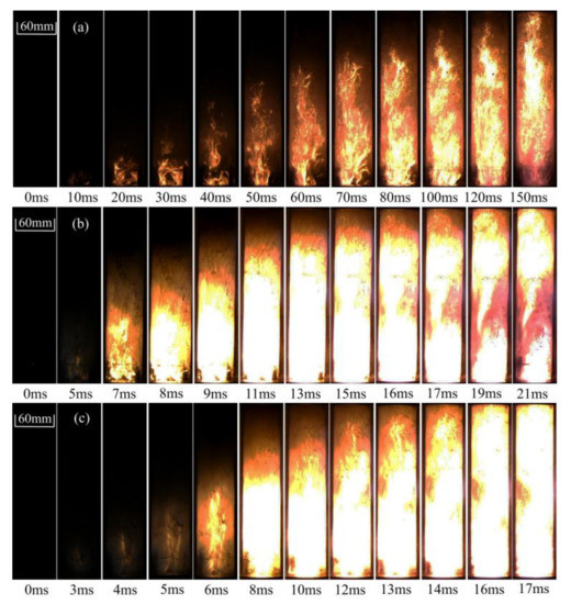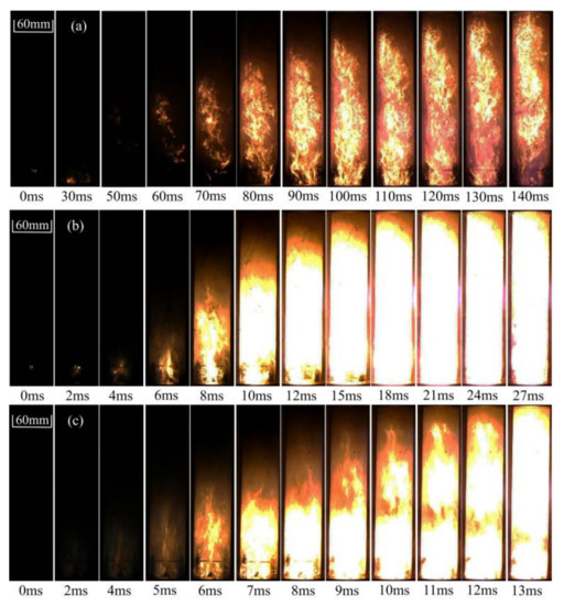 The variation in flame structure with time for 400 g/m3 polyethylene dust under different ethylene concentrations: (a) 400 g/m3; (b) 1%C2H4 + 400 g/m3; (c) 3% C2H4 + 400 g/m3.