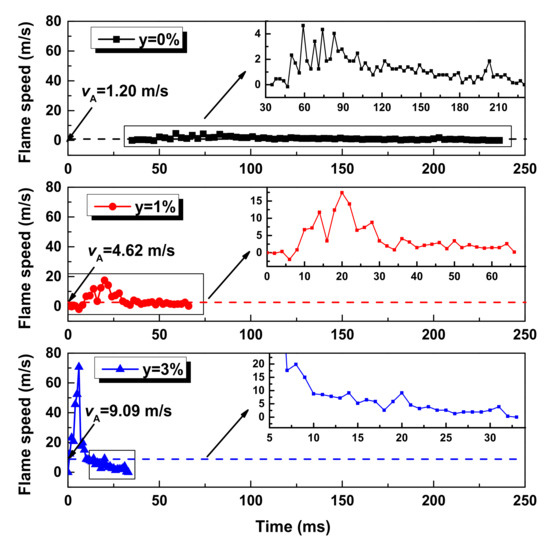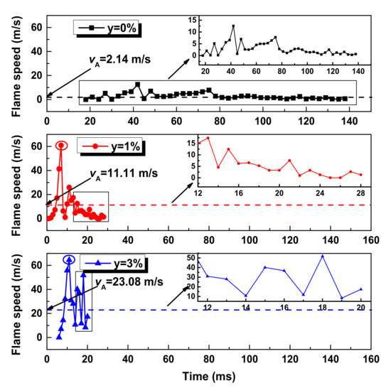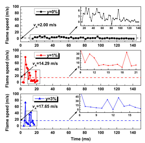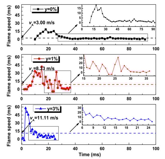 In Figure 9, the flame propagation velocity showed pulsation characteristics with increased pulsation amplitude after adding 1% ethylene. Additionally, the average flame propagation velocity increased from 1.20 to 4.62 m/s. With the increase in ethylene concentration to 3%, the fluctuation amplitude of the curve further increased, and the average flame propagation velocity further increased to 9.09 m/s.