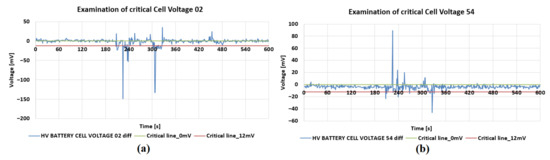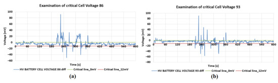 The first row of Table 5 shows the cell serial number. The second row indicates the time spent in the critical range. Longer-term discrepancies typically appeared in the first and last elements of the system. The last step is to highlight the worst-performing cells and examine them separately. Based on the previous results, Cell Voltage 2, Cell Voltage 54 Cell Voltage 86, and Cell Voltage 93 were also tested separately, relative to the average voltage.