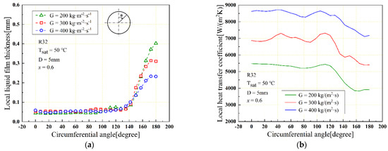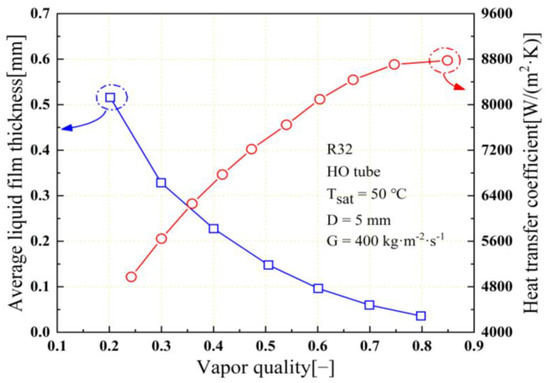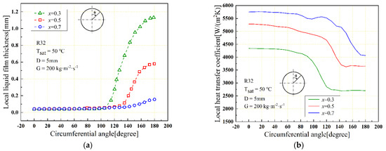 - The detailed liquid–vapor interface distribution, local liquid film thickness and local HTC are investigated to figure out the effect of mass flux and vapor quality on the condensation heat transfer characteristics of R32. At high vapor quality and high mass flux, the liquid–vapor interface shows a nearly circular distribution, while the local liquid film in the bottom part of the tube becomes thicker and the top part becomes thinner at relative smaller vapor quality due to the influence of gravity. The local HTC is affected by the local liquid film thickness and the gravity, surface tension, shear stress and inertia effect are combined to impact the distributions of the liquid and vapor phase.