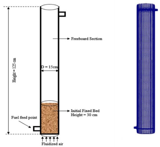 The fluidized gasifier selected for simulation is located at the University of Northern California and is shown (with a test stand) in Figure 1 []. The gasification reactor is 125 cm high with an inner diameter of 15 cm and an outer diameter of 20 cm. The outer wall of the reactor is wrapped with high-temperature-resistant insulation material and can be regarded as an adiabatic wall. The bed material in the fluidization reactor is quartz sand with a particle size of 200 μm and a density of 2648 kg/m3. In the initial state, it was deposited at the bottom of the reactor with a height of 30 cm and a porosity of 0.43. The reactor is in a pure nitrogen environment. The fluidized air temperature at the bottom of the reactor is 950 K, and fuel enters from the left inlet at the bottom of the reactor. After entering the reactor, the fuel is mixed with the bed material for the gasification reaction. The average particle size of biomass fuel particles is 600 μm, and the density is 1126.8 kg/m3. The industrial analysis and elemental analysis of the biomass fuel particles are shown in Table 3.