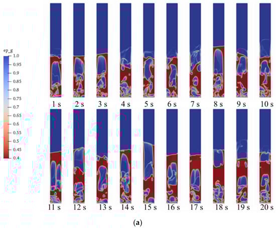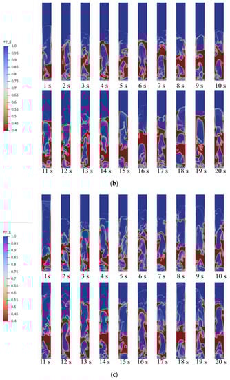 Before the coupling reaction, the initial bed temperature of 1050 K and equivalence ratios of 0.2, 0.3, and 0.4 are selected to simulate the gas–solid flow in the fluidized bed, and the reaction in the reactor is not considered in this process. Figure 3a–c show the changes in the gas–solid flow field simulated by the Euler–Euler model over time when the initial bed temperature is 1050 K and the equivalence ratio is 0.2, 0.3, and 0.4, respectively. Red represents the particle phase, darker color represents a larger volume share of the particle phase, and blue represents the gas phase. It can be seen from the three groups of pictures that bubbles are generated and broken in the bubbling gasification bed. With the increase in the equivalence ratio, the flow of air volume into the bottom of the reactor increases, and the average height of the bubbling bed also increases. After 4–5 s, the gasifier is basically in a stable bubbling fluidized state.