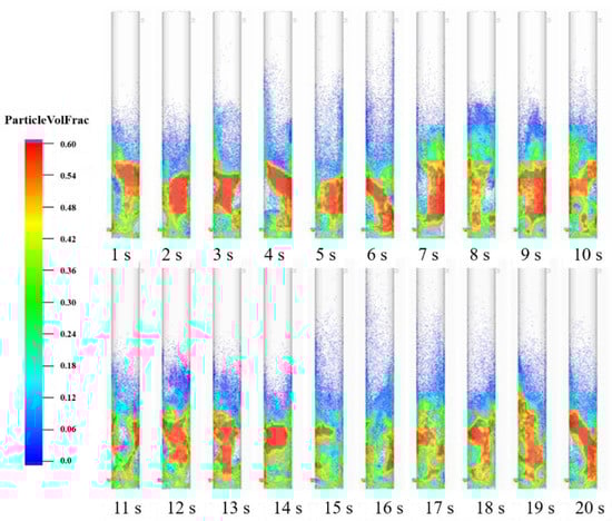 To verify the accuracy of gas–solid flow calculations, results are compared with previous studies using the Euler–Lagrange method. Figure 4 below is the calculation result obtained by using MP-PIC. The stable bed height calculated by the two methods is about 55 cm, and a similar cavitation structure is formed in the solid phase region. The formation and breaking of cavitation bubbles is similar. The size and shape of cavitation in the dense phase region is not much different, and the diameter of cavitation can reach 10–15 cm before crushing. At the same time, it can be seen from the two figures that the volume fraction of solid particles has certain similarity in the whole fluidized bed area. Through comparison, the accuracy of the two-fluid model based on KTGF was verified, and application of this subsequent chemical reaction model laid a baseline.