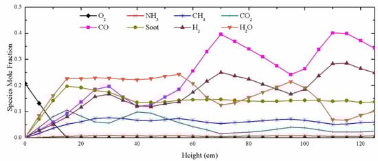 A coupling gas–solid flow reaction simulation is carried out for each working condition in Table 4. The results of 5–20 s after gas–solid flow stabilization in the gasifier were averaged to obtain the distribution of gases of each component in the furnace reactor. Figure 5 shows the distribution of each gas component along with the height of the reactor under the first group of working conditions, and Figure 6 shows the distribution of each gas component in the middle section of the reactor.