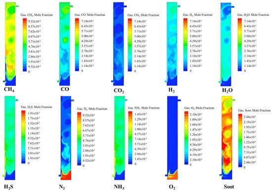 Mole fraction distributions of different gases in the middle section of the gasifier (ER = 0.2; T = 1000 K).