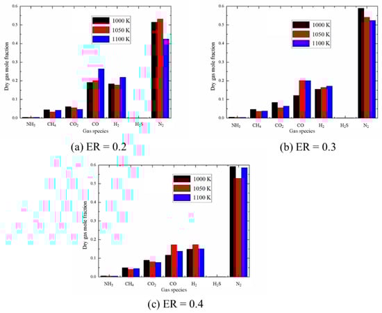 Figure 7a–c shows the influence of initial bed temperature (1000 K, 1050 K, and 1100 K) on gasification products at different equivalence ratios (ER = 0.2, 0.3, and 0.4). The ordinate is the average molar concentration of each gas component at the reactor outlet from 5–15 s. Because higher temperature is more conducive to gas–solid phase heterogeneous reactions [,], especially water evaporation and water–gas replacement reactions, the molar concentrations of CO and H2 at the outlet of the reactor increase with increased initial bed temperature. With the increase in temperature, the CO2 reduction reaction rate accelerates, which decreases CO2 concentration at the outlet. Higher temperatures are more favorable for gasification reactors, resulting in higher concentrations of CO and H2 in syngas at the outlet.