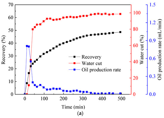 The liquid production characteristic curve included three parameters: recovery, water cut and oil production rate. For sandstone, the surface of the formation rock was mostly hydrophilic, and the seepage resistance of steam in the formation mainly came from the capillary force generated by the two-phase flow. In Figure 4, when the steam injection volume was approximately 0.3 PV, water started to appear at the outlet, and at this moment, the oil production rate reached a peak value of 0.81 mL/min. After that, due to the gradual formation of the dominant flow channel, the steam began to channel, and the water cut curve rose rapidly, corresponding to the rapid decrease in the oil production rate. During the subsequent displacement process, the flow of steam in the sandpack reached a steady state, the oil production rate fluctuated around the equilibrium value of 0.1 mL/min, and the recovery and water cut increased steadily as the remaining oil in the reservoir decreased. The ultimate recovery was near 48%, which was relatively low in terms of the thermal recovery of heavy oil.