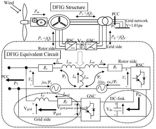 The DFIG grid-connected equivalent circuit [39,40] is shown in Figure 2, with AC-DC-AC power converters linked to the point of common coupling (PCC). The total power ( P T = P s + P g ) in Figure 2, is delivered considering the wind speed that is available in the circuitries of the rotor and stator of the wind turbine to the PCC for ω r > ω s . Additionally, only the stator active power P s     is supplied via a circuit of the stator to the PCC ( ω r < ω s ), while the active power P r absorption from the PCC is achieved with the converter [41]. The application of vector control in dq orientation stator frame synchronous axis would result in the 5th order dq representation [42] of the wind generator. The expressions of the components of the voltages of the stator and rotor in dq reference frame considering Figure 2 for the DFIG grid-connected equivalent circuit are: