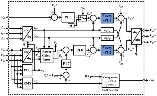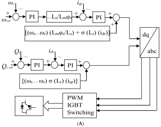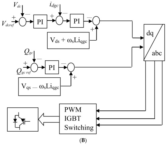 From Equation (9), C d c ,   V d c   a n d   P d c are the DC link capacitor, DC-link voltage and DC-link power. The RSC control of the DFIG wind turbine shown in Figure 3A is regulated by the q and d axis rotor currents i q r and i d r . This is performed by adjusting the active and reactive powers ( P s , Q s ) of the stator. The MPPT scheme of the wind generator obtains the P s . The q-axis current i q r regulates rotor speed, while the d-axis current i d r regulates the reactive power. The dq reference voltage components are generated for a Pulse Width Modulator (PWM) signal generator after a dq to abc transformation. The three-phase abc reference voltages are further used for the switching of the IGBTs in the circuitry of the RSC. Thus, the RSC controls the terminal voltage since reactive power is proportional to the voltage. In Figure 3B, the GSC of the wind generator employs a reference frame ac grid to control the DC-link voltage and regulate the reactive power dissipation via the grid side converters connected via the PCC to the grid side network. The Phase Lock Loop (PLL) provides the angle θ P L L , which is the effective angle used for abc-to-dq and dq-to-abc transformation. The d-axis current ( i d g c ) , regulates the DC-link voltage ( V d c ) , while the q-axis current ( i q g c ) regulates the reactive power ( Q g c ) . The dq reference voltages are generated and sent to the PMW signal generator after a dq to abc transformation. The generated three-phase reference abc voltages are further used for the switching of the IGBTs of the GSC circuitry.