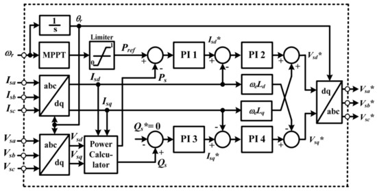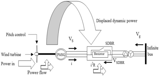 The SDBR dynamics in PMSG wind turbines are represented in Figure 10. The power converters of the PMSG are modeled considering the rotating frame of the Park’s transformation. By considering Figure 8, the symmetrical mathematical three-phase voltage source converter model could be expressed as [49]: