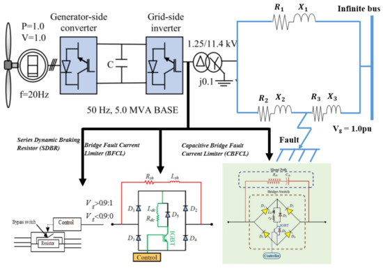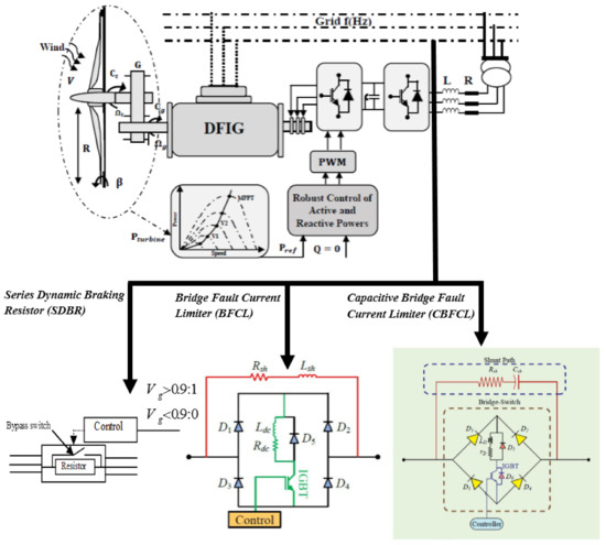 The hardware-based solutions of FCLs in DFIG and PMSG wind turbines in wind farms have shown promising results in augmenting the performance of these wind turbines during grid faults [26]. There are two types of FCLs; Superconducting Fault Current Limiters (SFCL) with no power loss, good speed control and through complex circuitries [27,28,29]; and Non-superconducting Fault Current Limiter (NSFCL) that can resolve the issues of the SFCLs, in addition to providing FRT capabilities [30,31]. The Insulated Gate Bipolar Transistor (IGBT) technology led to the widespread use of NSFCLs than the others. The Series Dynamic Braking Resistors (SDBRs) [32,33]; Bridge Fault Current Limiters (BFCLs) with resistive, inductive and capacitive elements [34]; and parallel resonance FCL (PRFCL) [35] were employed in variable speed wind turbines FRT.