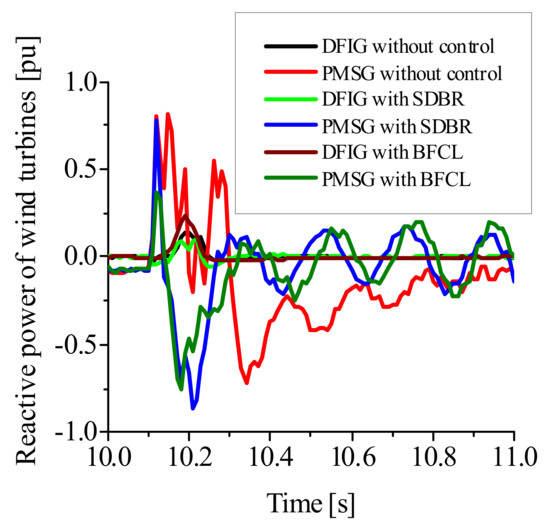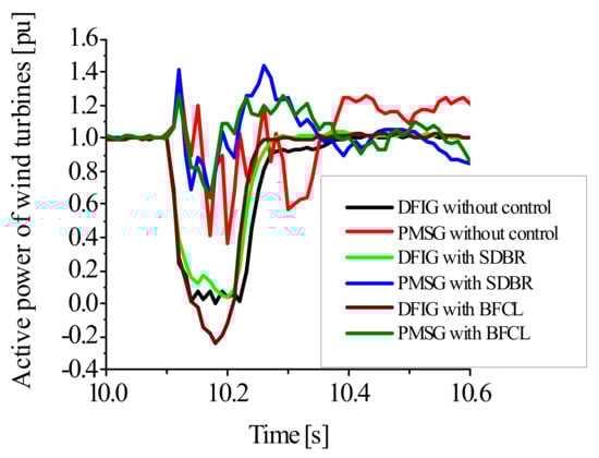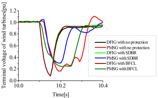 The separate control strategies of DFIG and PMSG wind turbines using various schemes already exist in the literature; ranging from Fault Current Limiters (FCLs) in the DFIG wind turbines [11,12,13,14]; to reactive power compensation, crowbar and DC chopper [15,16]; to sliding mode control for Maximum Power Point Tracking (MPPT) [17,18]. The Fault Ride Through (FRT) assessment of a DFIG wind turbine was carried out in [19,20,21], with the help of different control topologies, and algorithms for wind energy conversion were reported in [22]. On the other hand, for the PMSG wind turbine, the limitation of the maximum current and MPPT power converters were studied in [23,24], where the DC-link voltage was kept constant near its limit during grid fault. The enhancement of the PMSG wind turbine was also performed in [25], using the superconducting fault current limiter (SFCL) control strategy.