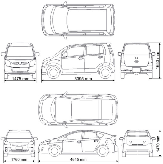 Shape of the experimental vehicle: small van (top), sedan (bottom).