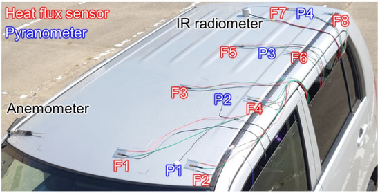 Heat flux sensors and other sensors on the vehicle roof: small van (top), sedan (bottom).