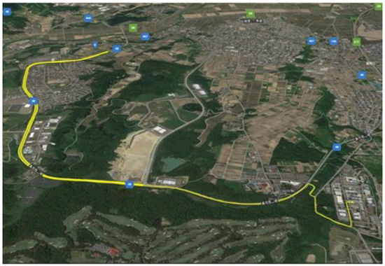 The convective heat transfer coefficient (h) between the vehicle roof surface and ambient air was measured using typical commercial vehicles. Figure 1 shows the dimensions and shapes of the experimental vehicles: a small van (Mazda Motor Corporation, AZ Wagon) and sedan (Toyota Motor Corporation, Prius). A small van is a small box-type car with a mostly flat roof, whereas a sedan is a middle-class car with a more rounded roof. Figure 2 shows photographs of the experimental setup for the vehicle roofs. Eight film heat flux sensors depicted as F1–F8, four pyranometers depicted as P1–P4, an anemometer, and an infrared (IR) radiometer were mounted on the roof to measure the net heat flux through the sensor plane, solar irradiance, airflow speed, and IR thermal radiation flux from the sky, respectively. The heat flux sensors and anemometers have built-in temperature sensors (K-type thermocouples) that measure the heat flux and air temperatures, respectively. Table 1 lists the specifications of the sensors including uncertainty values estimated from the catalogue accuracy values of each sensor and loggers according to the error propagation law. All the sensors were connected to a data acquisition instrument (HIOKI, LR8416) to monitor and record the sensor outputs during the experiment. The sampling interval was set to one second. The heat flux sensors F1, F3, F5, and F7 were installed along the centerline (symmetry line) of the roof, and the heat flux sensors F2, F4, F6, and F8 along the edge line of the roof. The heat flux sensors were placed at equal intervals (0.5 m) from the front to rear of the vehicle. Table 2 summarizes the weather conditions used in the experiments. Calm days were chosen, and average wind speeds were low (1.12 and 1.5 m/s). The small van experiment was conducted in summer (2 August 2021), whereas that of the sedan was conducted in autumn (4 October 2021). The experiments were carried out at night to eliminate the effect of solar radiation because unsteady solar radiation complicates the calculation of h and can cause errors in the present measurement. Pyranometers were used to confirm the absence of solar radiation during the experiment. Transparent flexible film heaters were inserted between each heat flux sensor and roof surface via thin adhesive layers. These heaters were heated at a constant power (7 W) during the experiment to maintain the accuracy of the measurement by maintaining the heater temperature higher than the air temperature. Electrical power was supplied to the heater using a direct current (DC) power supply (Matsusada Precision, PK120-3.3). Similar methods using thin-film heating elements with low heat capacity have been studied [28,29]. These methods were employed to clarify the detailed spatial distribution of time-varying h in turbulent flows. Although the present study does not aim to clarify such a detailed spatial characteristic, but rather a coarse trend on the vehicle roof, the basis of the measurement methodology is the same. Similar methods using thin-film heat flux sensors have also been applied to measure the convective heat flux from parts of the human body [30,31,32]. It is noteworthy that this experiment was performed without the VIPV module to estimate h on the smooth surface of a real car because the actual VIPV module is generally integrated into the car roof without any roughness so that it does not create resistance to airflow. The driving route is illustrated in Figure 3. The vehicle speed was in the range of 20–60 km/h and was gradually increased as much as possible. The vehicle position was recorded using a global positioning system (GPS).