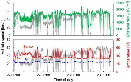 Measured values at the FI position and anemometer for the small van: vehicle speed (gray), net heat flux (green), sensor temperature (red), and air temperature (blue).