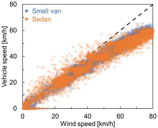 Relationship between vehicle speed and wind speed: small van (blue), sedan (orange). The vehicle speed was calculated from GPS data. Wind speed was measured using an anemometer, as shown in Figure 2.