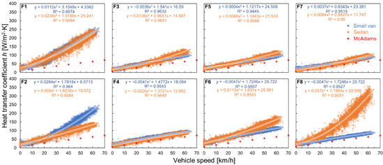 Figure 7 shows the trend of h calculated from the measured dataset as a function of vehicle speed. Each graph corresponds to the positions F1–F8, as shown in Figure 2. For the small van, h at the frontmost positions F1 and F2 is clearly higher than at the positions behind it. For example, h at position F1 at 50 km/h was 2.2–2.5 times higher than that at positions F3, F5, and F7. There is no remarkable difference between the characteristics along the centerline of the roof (i.e., F1, F3, F5, and F7) and the edge line of the roof (i.e., F2, F4, F6, and F8). The higher h characteristic at the frontmost position could be attributed to the shape of the small van. The velocity boundary layer is expected to become thinner at the front of the roof, and the local airflow velocity can increase because the slope of the vehicle body rapidly changes from the front glass window to the flat roof, as shown in Figure 2. For the sedan, the trend along the centerline of the roof is similar to that of the small van, whereas the trend along the edge line of the roof is remarkably different. Position F2 in the edge line shows a lower h than position F1 in the center line, whereas position F8 in the edge line shows a significantly greater h than position F7 in the center line. This characteristic can be attributed to the rounded shape of the sedan. According to the literature on the aerodynamics of typical passenger vehicles [33,34,35], complicated turbulent flow structures occurring at the rear edge of the vehicle can contribute to convective heat transfer enhancement.