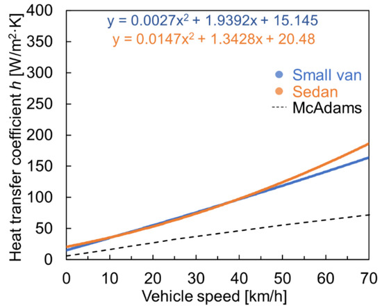 Figure 6 shows the relationship between vehicle speed and wind speed for the small van and sedan. The vehicle speed was calculated from the GPS data, whereas the wind speed was measured using an anemometer attached at the front edge of the vehicle roof, as shown in Figure 2. Hence, wind speed represents the local airflow velocity near the vehicle roof surface. Each vehicle shows a similar trend, in which the wind speed increases nonlinearly as the vehicle speed increases. This indicates that the local airflow velocity near the roof surface at the front edge is larger than that outside the velocity boundary layer, owing to the slope of the roof. This phenomenon is similar to that occurring in the flow around the upper part of the airfoil. The local airflow velocity can vary depending on the roof position. Hereafter, the vehicle speed is used as a reference speed, that is, a representative wind speed, for the convective heat transfer coefficient.