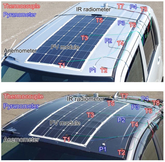 VIPV modules and sensors on the vehicle roof: small van (top), sedan (bottom).
